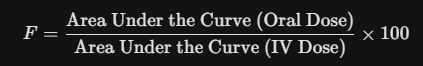 Where AUC is the Area Under the Curve of a concentration-time graph. An intravenous (IV) dose is typically considered 100% bioavailable (F=1), as it bypasses all digestive barriers.