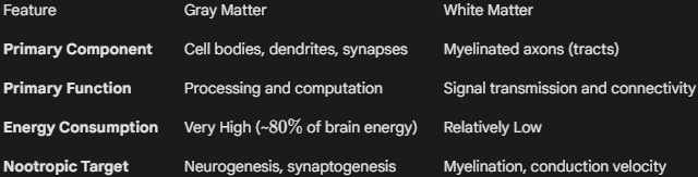 - Metabolic Demand: Gray matter is the most metabolically expensive tissue in the body, consuming significantly more oxygen and glucose than white matter. Nootropics that enhance Cerebral Blood Flow or Mitochondrial Efficiency are essential for sustaining the high energy requirements of gray matter during intense "Deep Work" sessions.