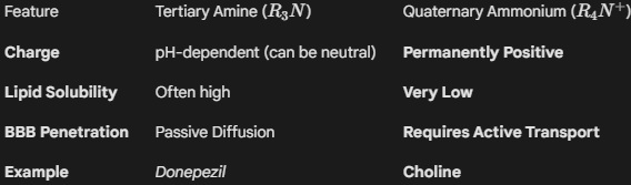 - Peripheral vs. Central Effects: Many quaternary ammonium drugs are designed specifically not to enter the brain. For example, certain muscle relaxants use this structure to ensure they only affect the body (peripheral) without causing sedation or cognitive changes (central).
