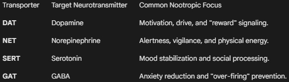 - Transporter Occupancy: The percentage of transporters physically "plugged" by the nootropic; usually measured via PET scans using radioactive tracers.