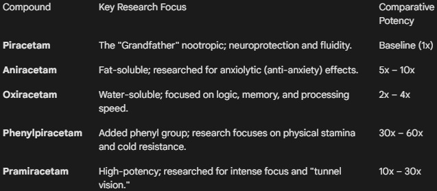 - Vascular & Oxygen Utilization: Some racetams improve cerebral blood flow (microcirculation) and increase glucose and oxygen consumption in the brain, providing the metabolic "fuel" required for heightened states of focus.