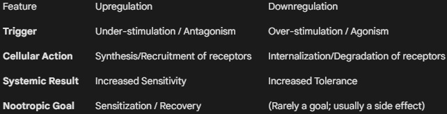 Research Note: Upregulation is a metabolically expensive and time-consuming process for the neuron. Unlike the rapid "shut-down" of downregulation, upregulating a receptor system can take weeks of consistent signaling or specific nutrient availability (like phospholipids for membrane construction). This explains the "lag time" often seen in the efficacy of neuro-regenerative nootropic protocols.