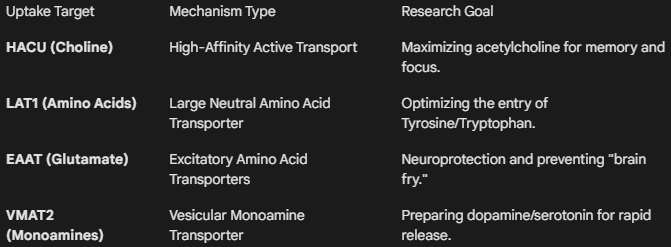 - The Competition Effect: Many amino acid precursors (like L-Tyrosine and L-Tryptophan) share the same transport carriers to cross the blood-brain barrier and enter neurons. Researchers study "Competitive Uptake" to ensure that a high dose of one nootropic doesn't accidentally block the uptake of another essential nutrient.