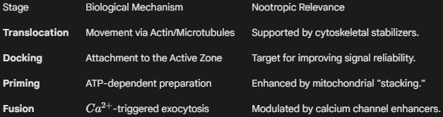 - Vesicular Endocytosis: After release, the vesicle membrane must be reclaimed and remade. Nootropics that support Phospholipid synthesis (like Citicoline or Phosphatidylserine) provide the raw materials to repair and recycle vesicles, preventing the "crash" that occurs when a neuron runs out of storage packets during intense study or stress.