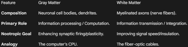 Research Note: While gray matter often gets the most attention in nootropic circles (due to its link to "thinking"), the White Matter determines how well those "thoughts" are coordinated. A "White Matter Stack" is often considered a long-term investment; unlike the immediate effects of a stimulant on gray matter activity, structural changes to white matter occur over months of consistent nutritional and lifestyle support.