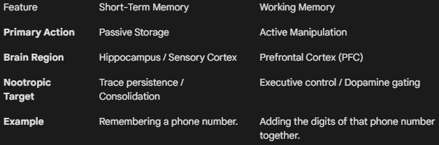 - Persistent Neuronal Firing: Unlike long-term memory, WM depends on the continuous firing of neurons in the PFC. Nootropics that support Mitochondrial ATP or modulate HCN channels (like Guanfacine in clinical research) help maintain this high-energy firing state, effectively increasing the "size" of the mental scratchpad.