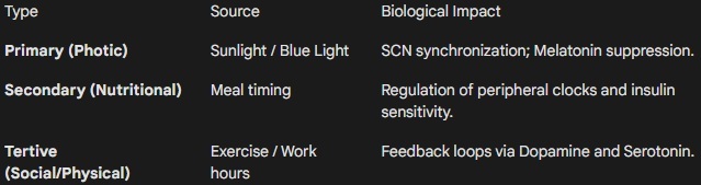 Definition: A Zeitgeber (German for "time-giver") is any external cue that entrains the endogenous biological rhythms of an organism. The primary Zeitgeber for humans is light, which is sensed by specialized photosensitive retinal ganglion cells. These cells transmit signals via the retinohypothalamic tract to the Suprachiasmatic Nucleus (SCN)—the brain's master clock. Other "non-photic" Zeitgebers include food intake, ambient temperature, social interaction, and physical activity. In nootropic research, Zeitgeber management is the foundation of Sleep-Wake Cycle optimization and the prevention of "Social Jetlag."